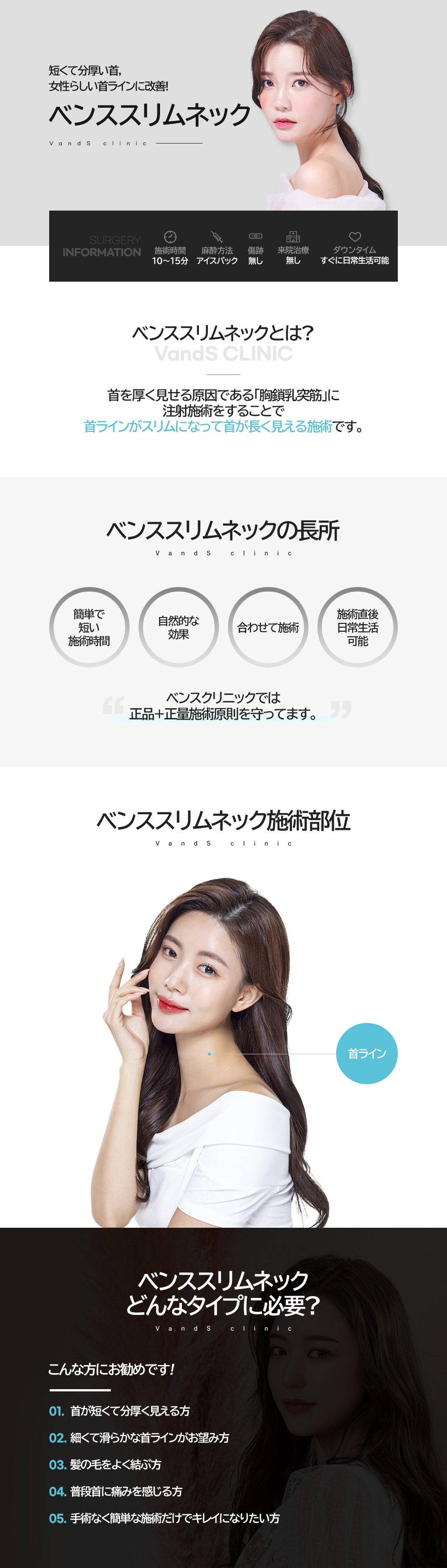首を太く見せる原因である首斜筋(胸鎖乳突筋)に注射施術を行い、首のラインが細くなり、首が長く見える施術です。