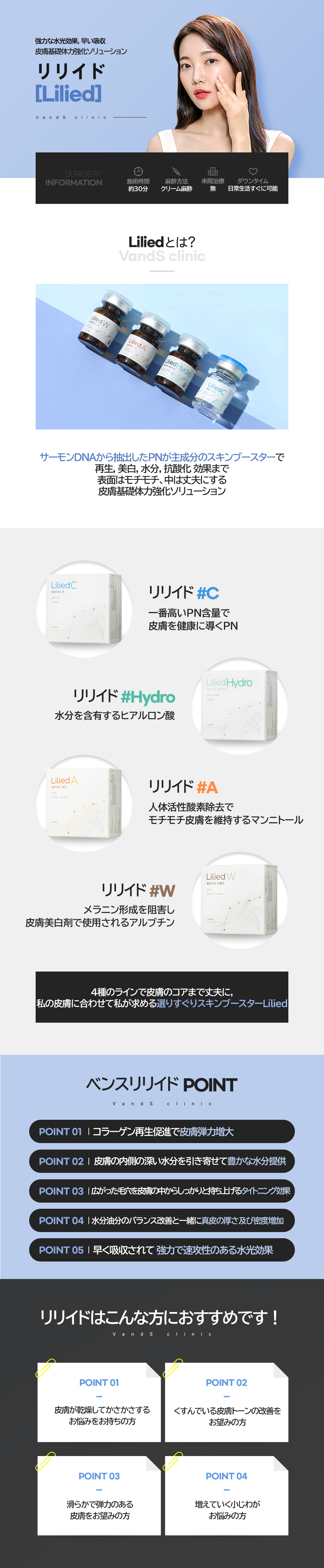 A. 従来のハイジュ水光注射は医薬品ですが、 リリイドMはプレミアムヒアルロン酸ナトリウムを含む医療機器・組織修復用生体材料です。厳格な精製プロセスを経て作られた製品で、肌に即座に水分をチャージし、肌内部のコラーゲンを再生することができます。特に吸収が早く、施術後すぐに日常生活が可能です。
