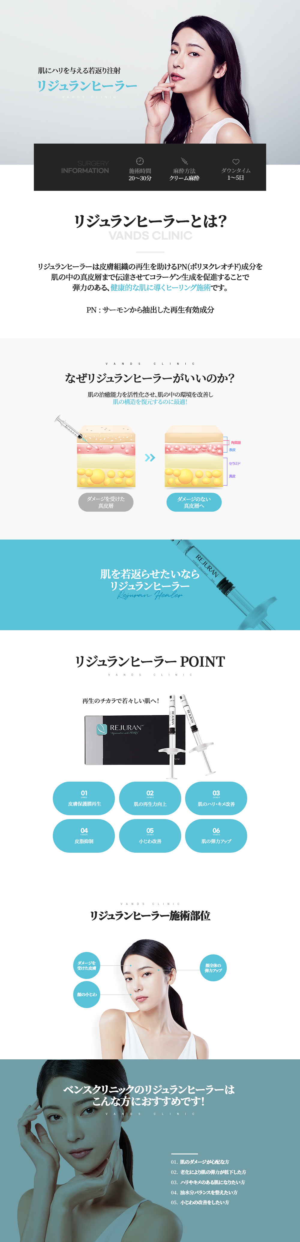 リジュランヒーラーは、生体適合物質であるポリヌクレオチド(PN、polynucleotide)という成長因子複合体です。単純に表皮層に水分を供給するマスクパックとは異なり、薄くたるんだ肌の表皮層と真皮層の根本的な再生を働きかけ, 健康的でハリのある肌へと導く施術です。