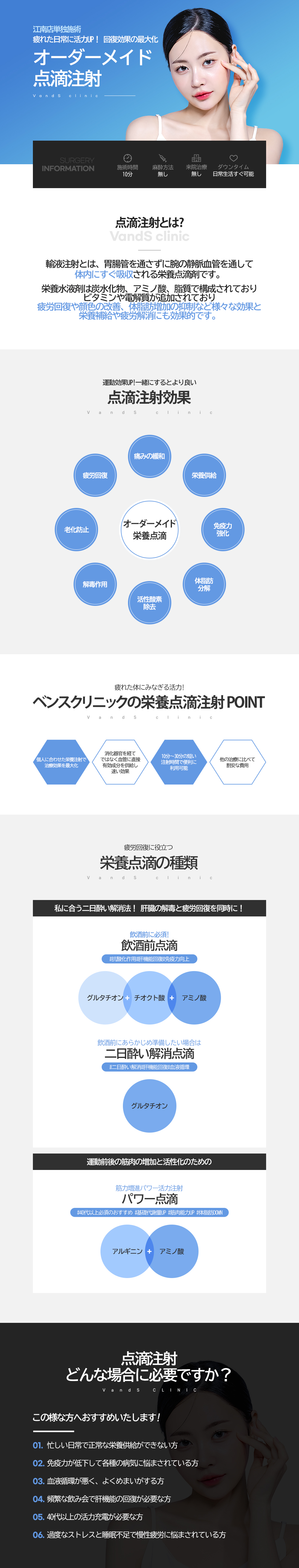 点滴形式の施術のため、腕にあざ・腫れ・軽い痛みが生じる場合がございますが、いずれも一時的なもので自然に回復いたします。