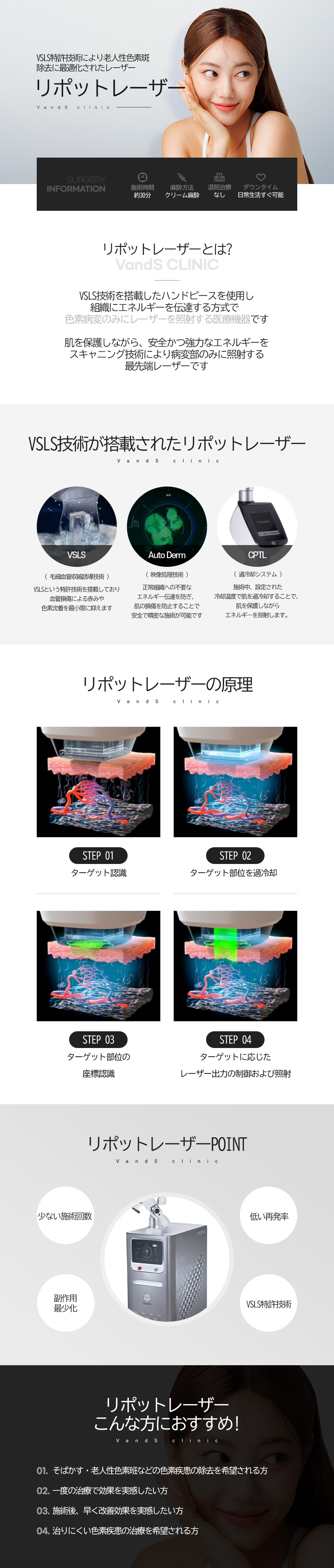 不均一な色素分布に対応し、レーザーの強度を自動調節します。ハイパークーリングテック・ハンドピースを使用することで痛みを軽減します。施術後すぐに日常生活に戻れます。コンタクトクーリング方式のCPTL技術を採用しています。冷却方式のVSLS®技術を採用しています。
